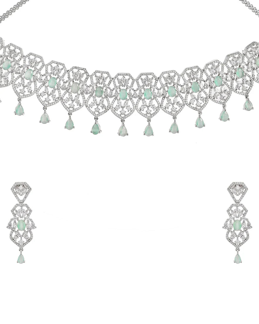 Crafted in rhodium plated brass, this jewellery set accents in a refined layout, offering graceful brilliance and comfortable wear for festive and wedding styling.