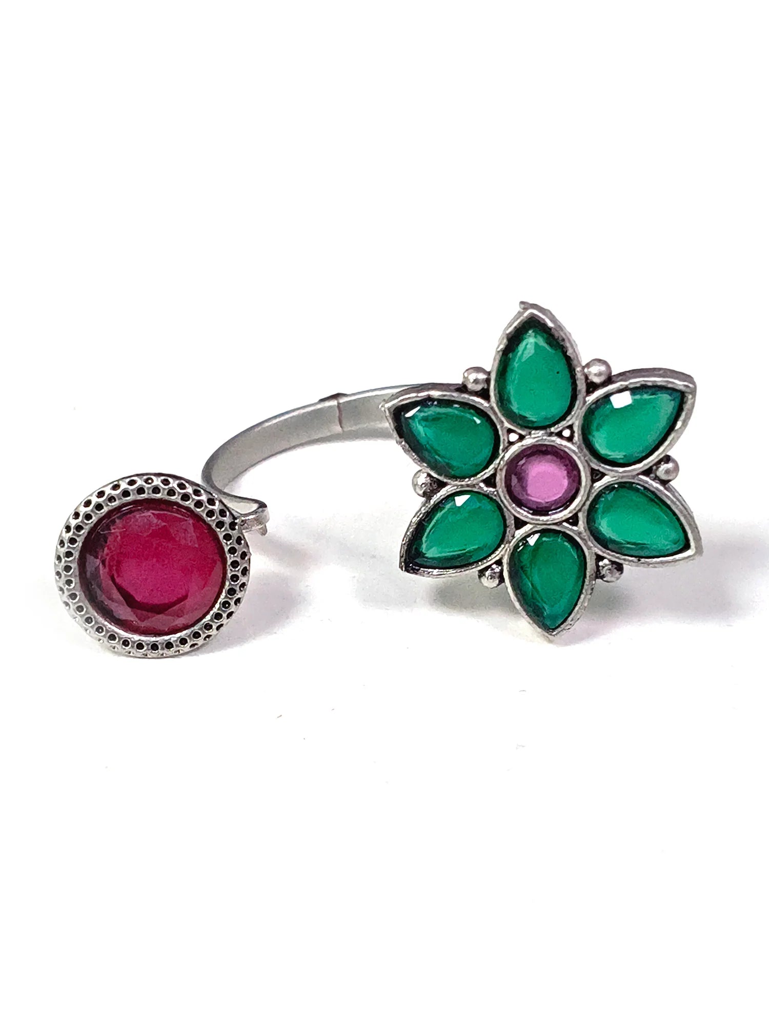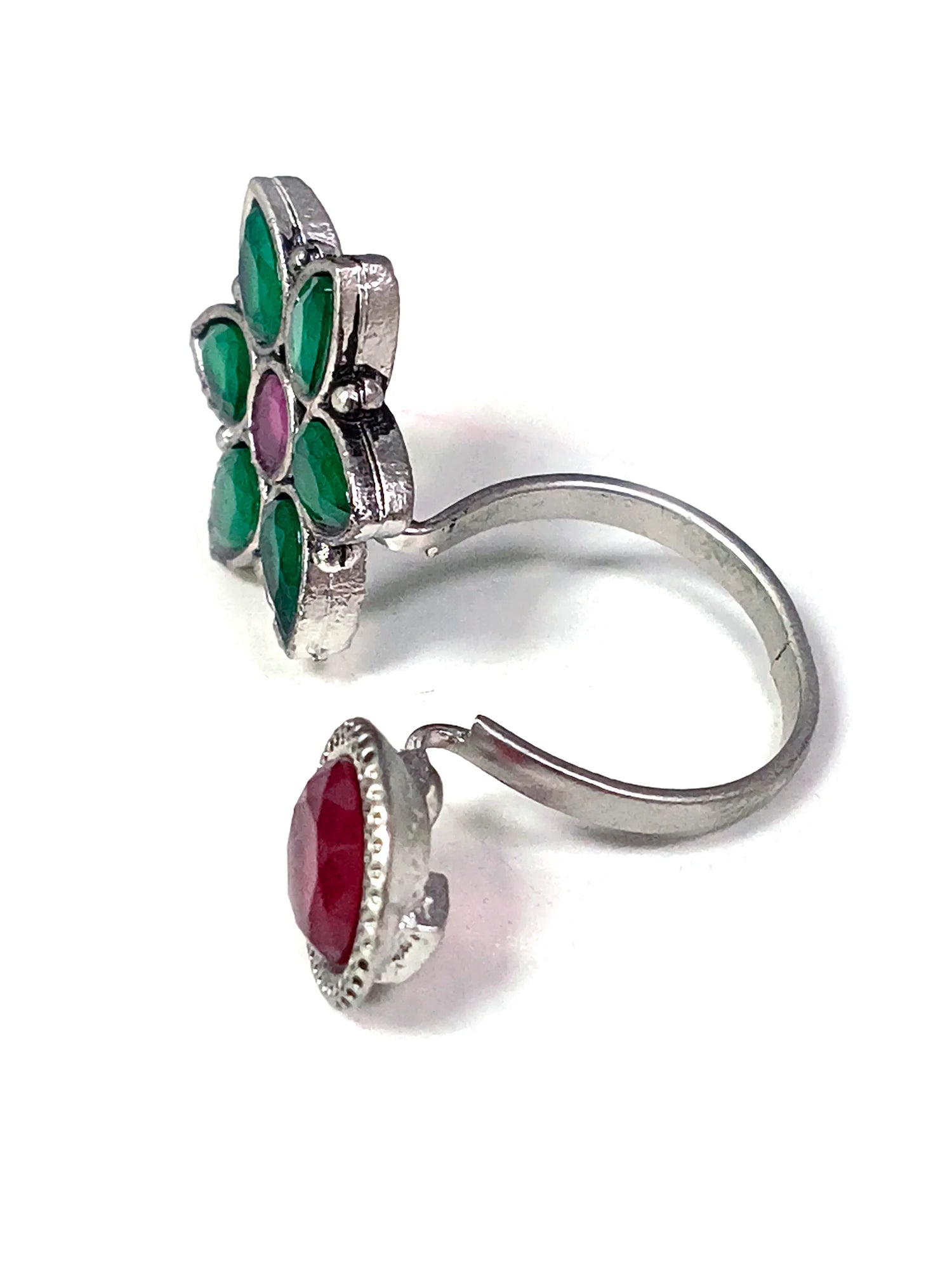 Rings :This rhodium-plated adjustable finger ring features a striking floral design studded dazzling green & red zirconia, offering an opulent and luxurious appeal.