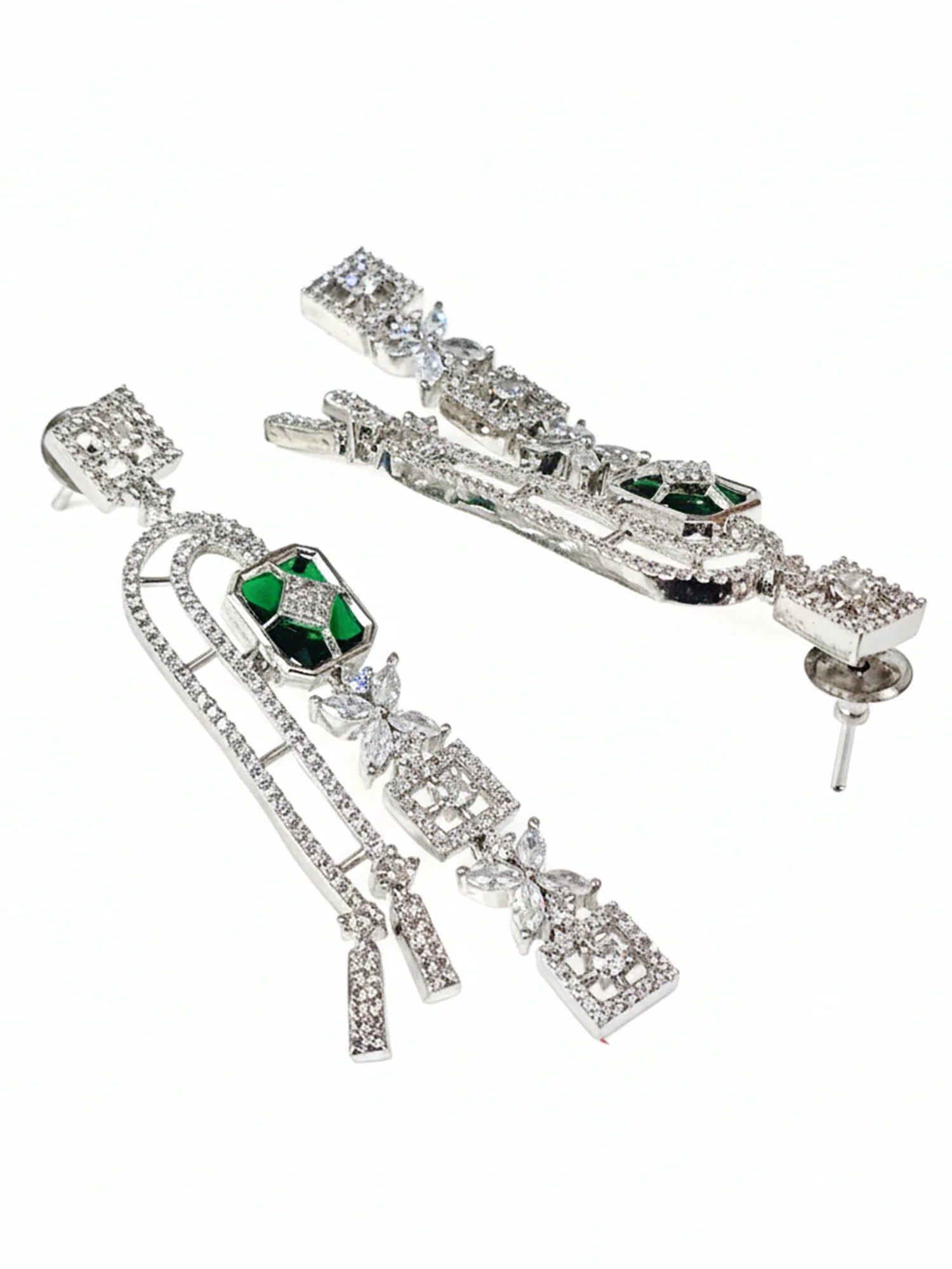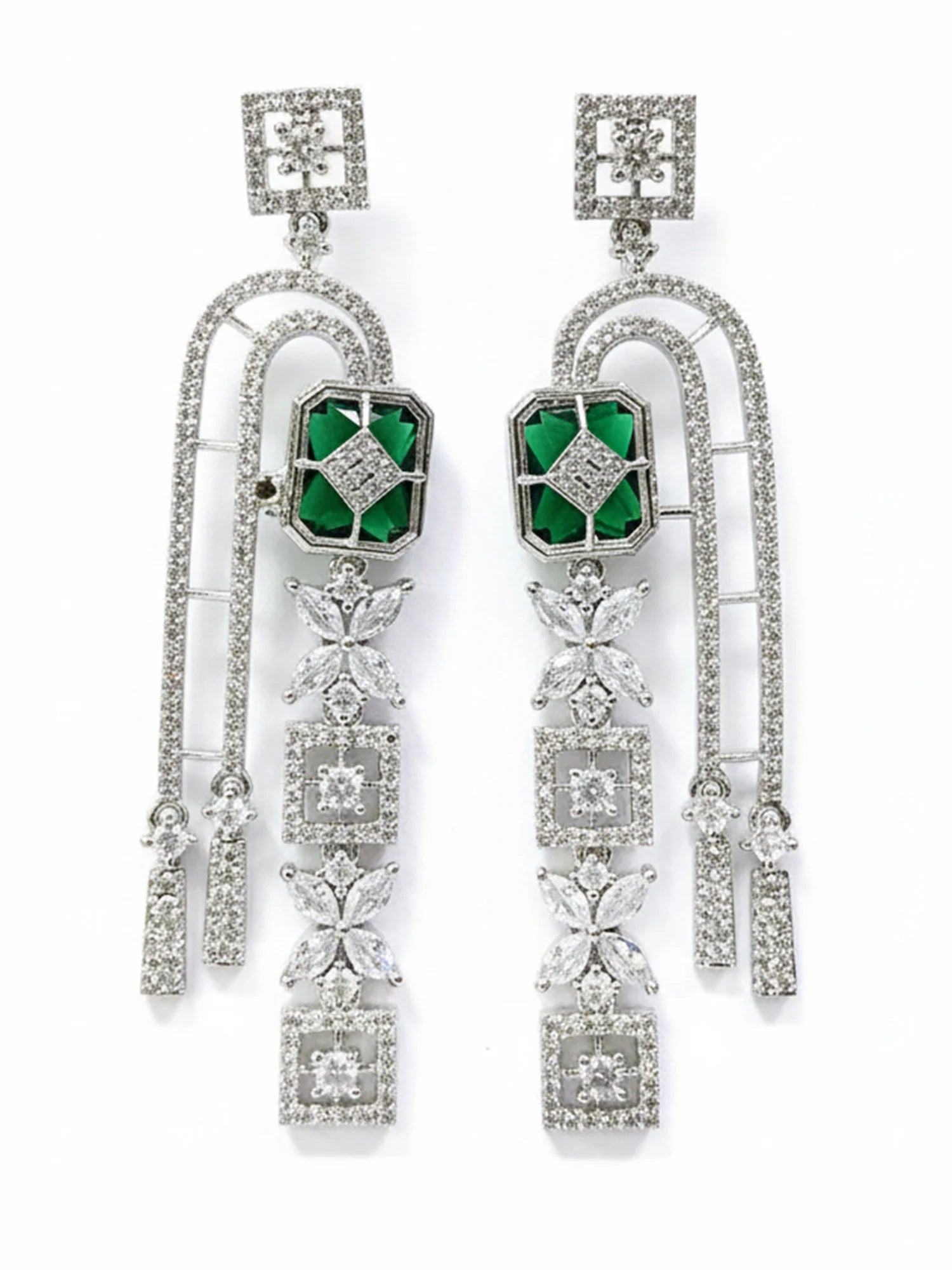 Rhodium-plated statement drop earrings crafted with emerald green and white crystal AD stones in a long, elegant layout—perfect for festive, party and wedding-ready styling.