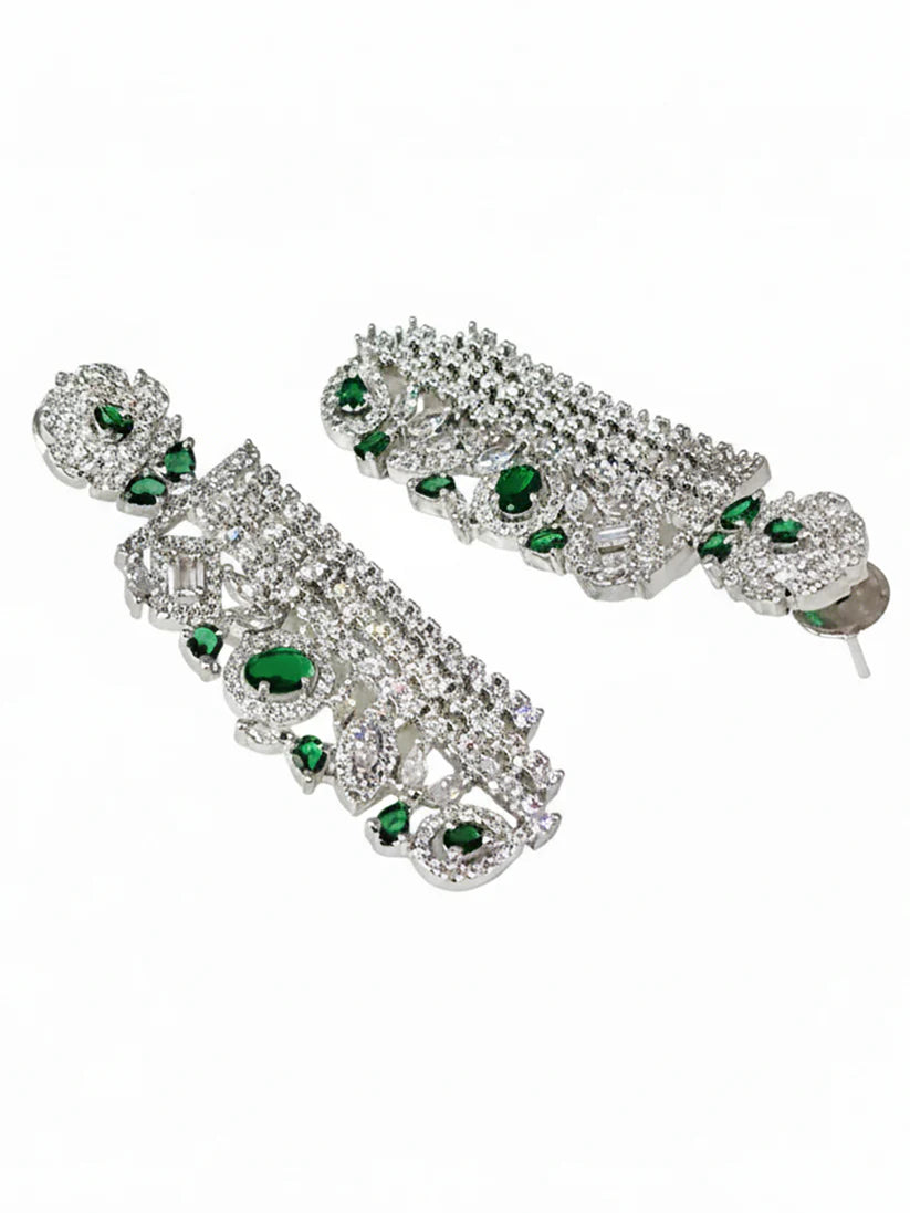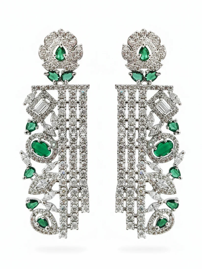 Rhodium-plated statement drop earrings crafted with emerald green and white crystal AD stones in a long, elegant layout—perfect for festive, party and wedding-ready styling.